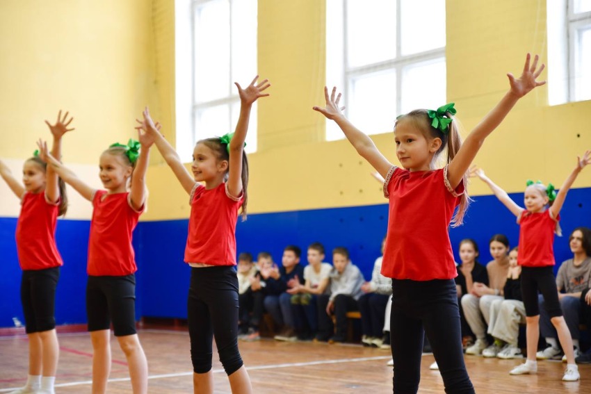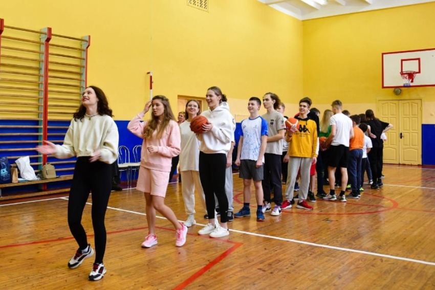 Воспитанники гимназии встретили спортсменов ярким танцевальным выступлением, после чего наши игроки и тренер показали ученикам базовые баскетбольные упражнения и элементы.